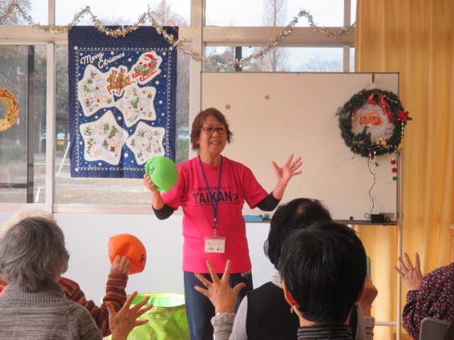 クリスマス使用に飾りつけされた公民館で体操です♪