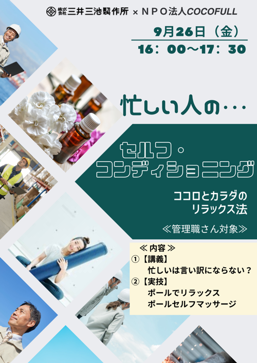 自分にあったメンテナンス法を見つけて、身につけて、ルーティン化できると素敵です。また、管理職の方が自ら健康に気を付けていただけると、他の従業員の健康意識も必然的に高まってくると思います。そのような願いを込めての90分のレッスンでした!